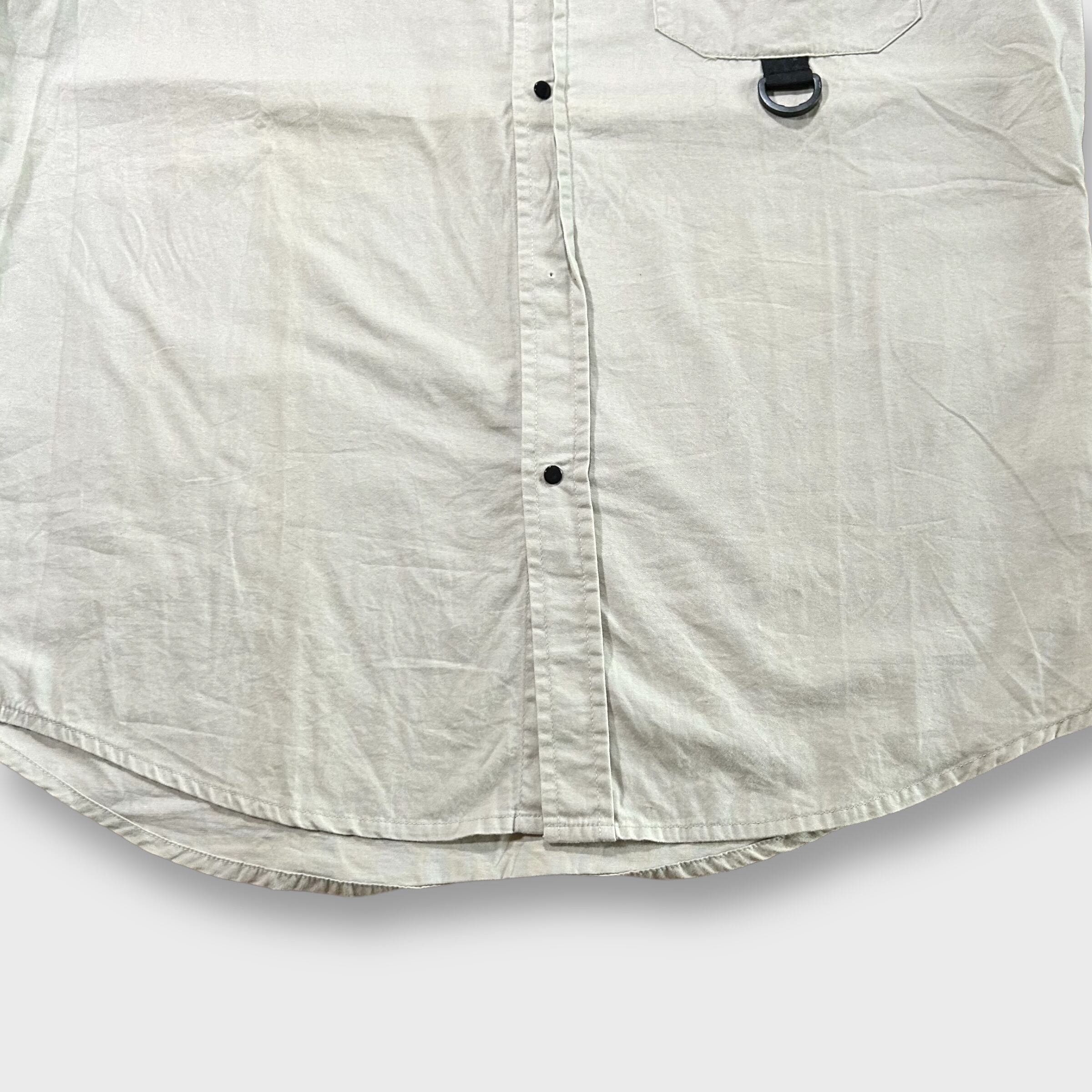 アシンメトリーな袖のライン、スナップボタン、Dリングと1枚で主張のあるシャツですね。